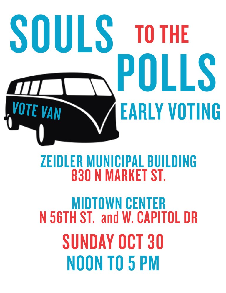 On Sunday, October 30th Progressive Baptist Church and other churches around the city will participate in “Souls to the Polls.” Transportation will be provided by Milwaukee Inner City Congregations Allied for Hope (MICAH) to take members to participate in early voting on that day.